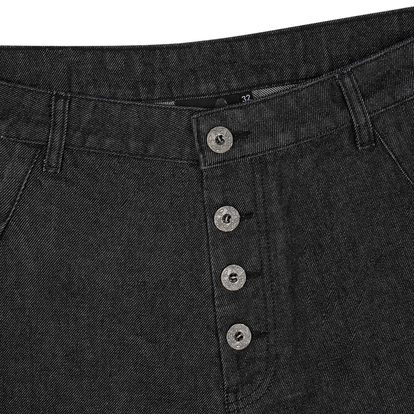 14,5oz raw denim / 100% cotton / embroidery on back / embroidered leather patch / pleats on front / custom buttons / wash inside out / fits true to size