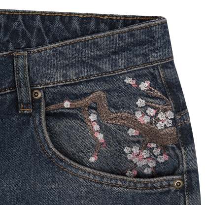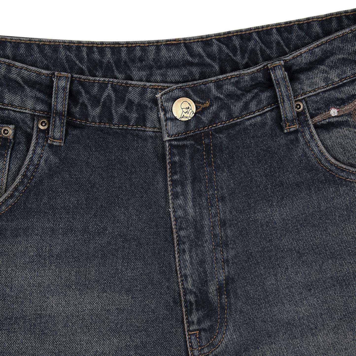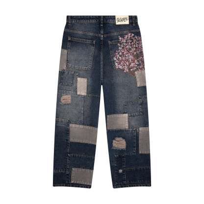 14,5oz denim / 100% cotton / 20+ hand sewn patches all over / embroidery on front pocket and back / embroidered leather patch / washed effect / distressed patches / wash inside out / fits true to size