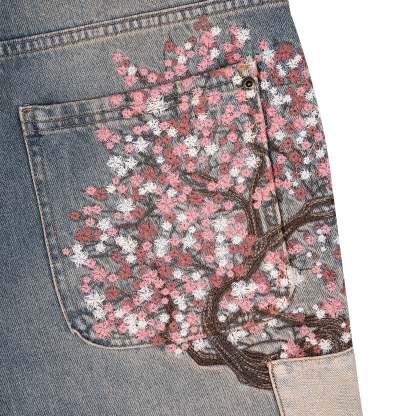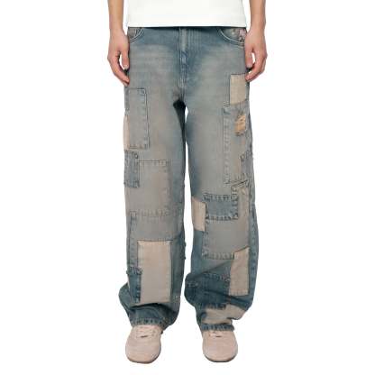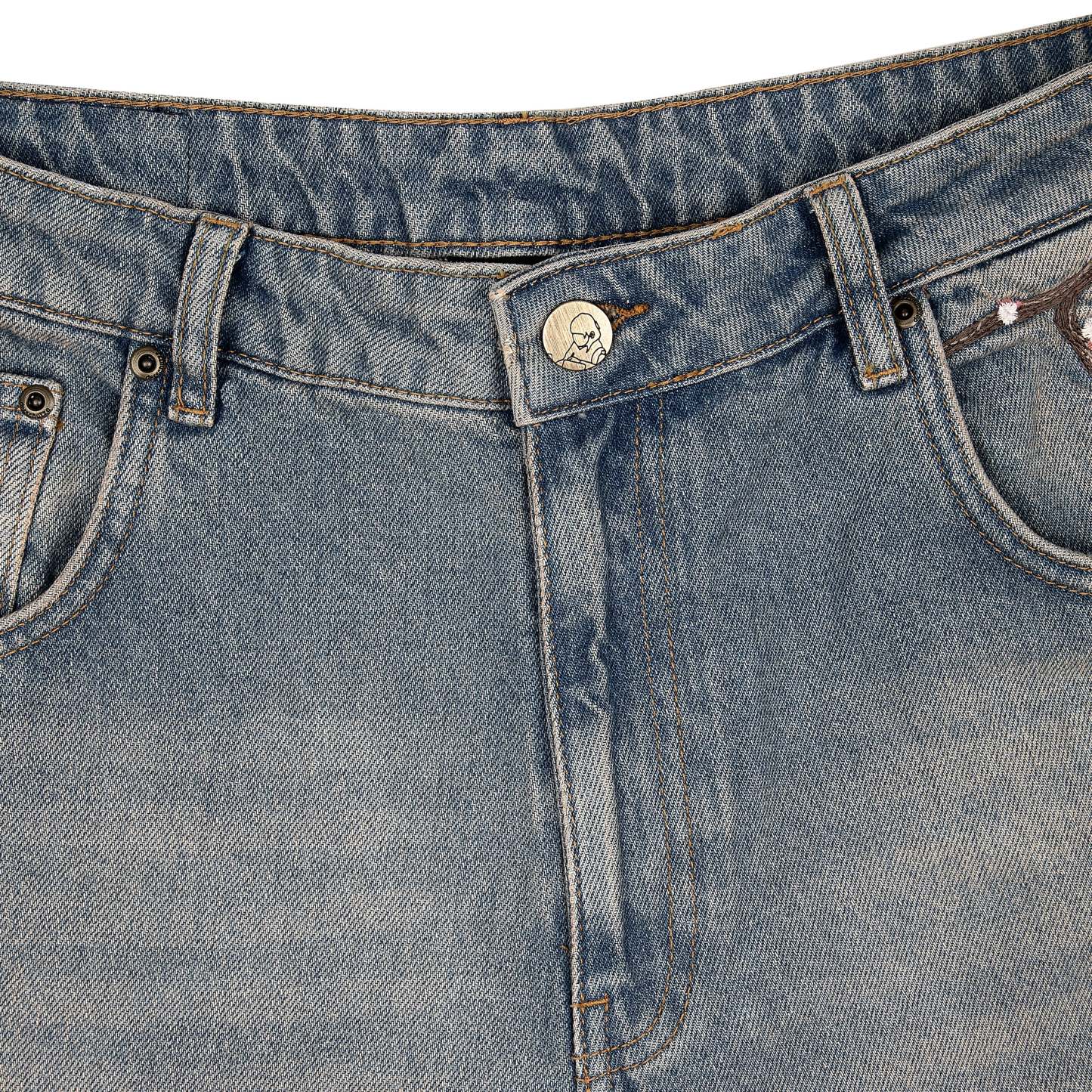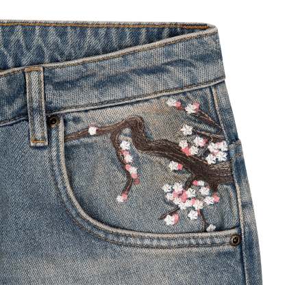 14,5oz denim / 100% cotton / 20+ hand sewn patches all over / embroidery on front pocket and back / embroidered leather patch / washed effect / distressed patches / wash inside out / fits true to size