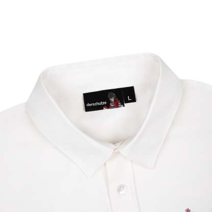 poplin fabric / 70% cotton 30% polyester / embroidery on front / custom buttons / curved hem / relaxed fit / fits true to size
