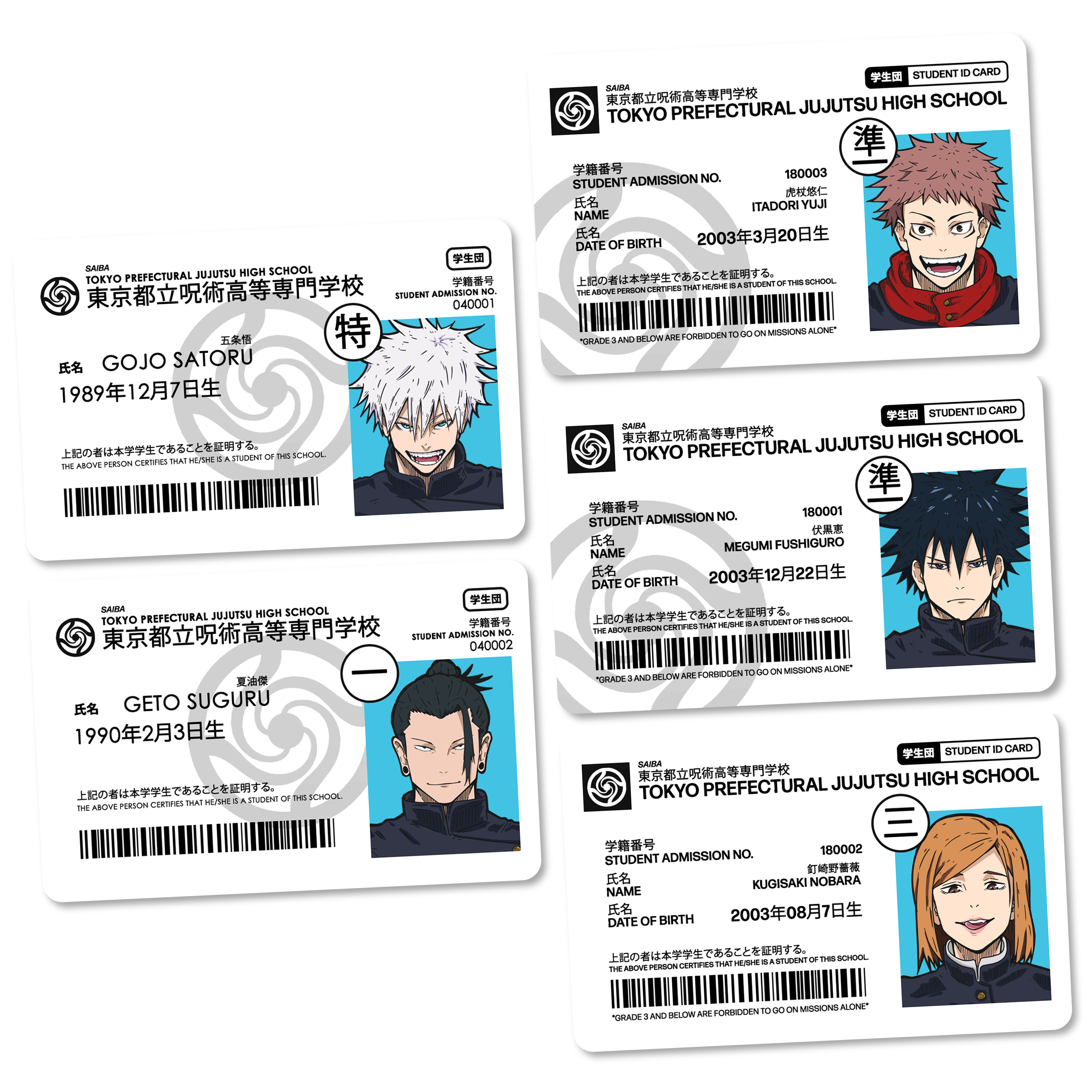 Identification cards for the past and present students of Jujutsu Metropolitan Curse Technical College.