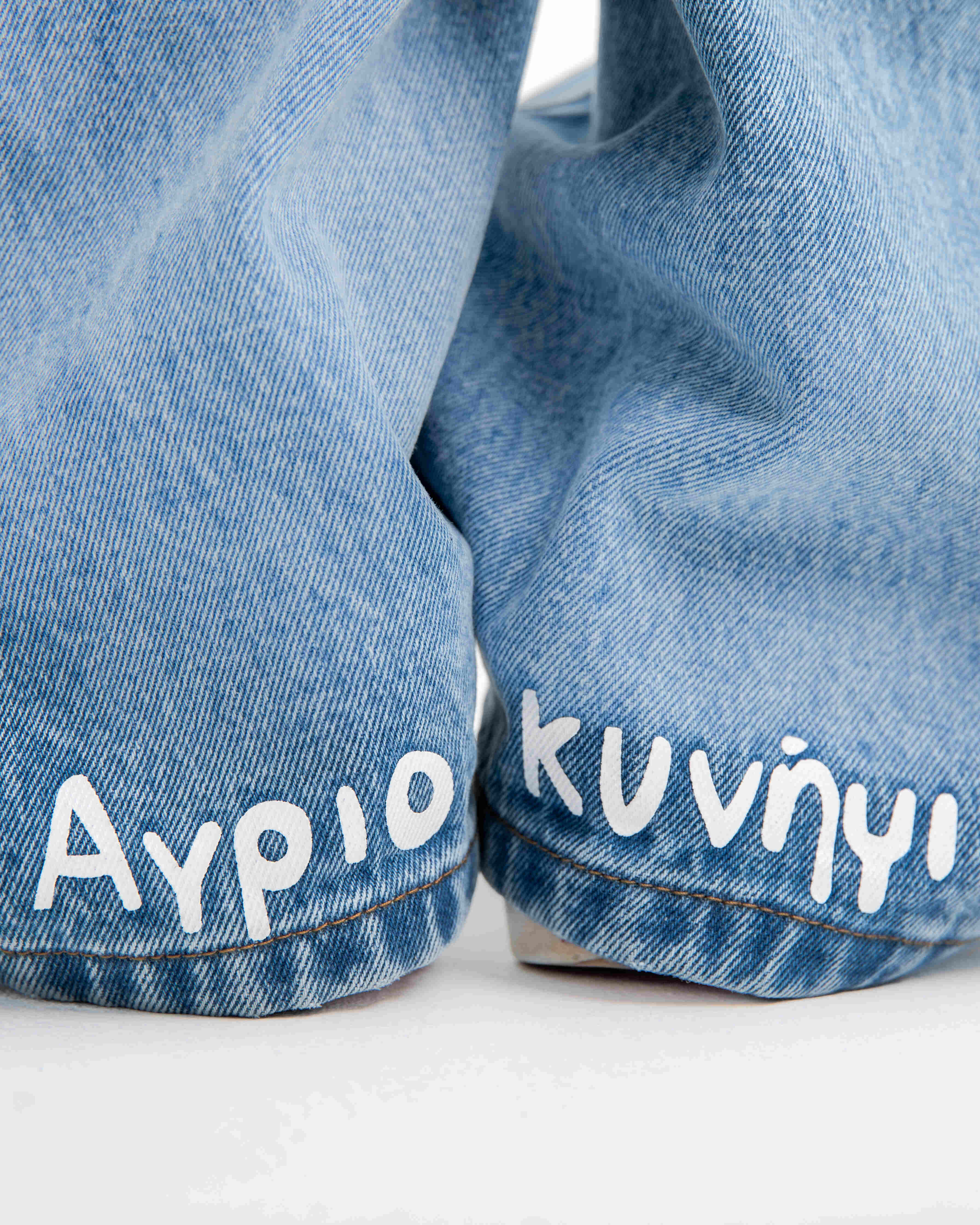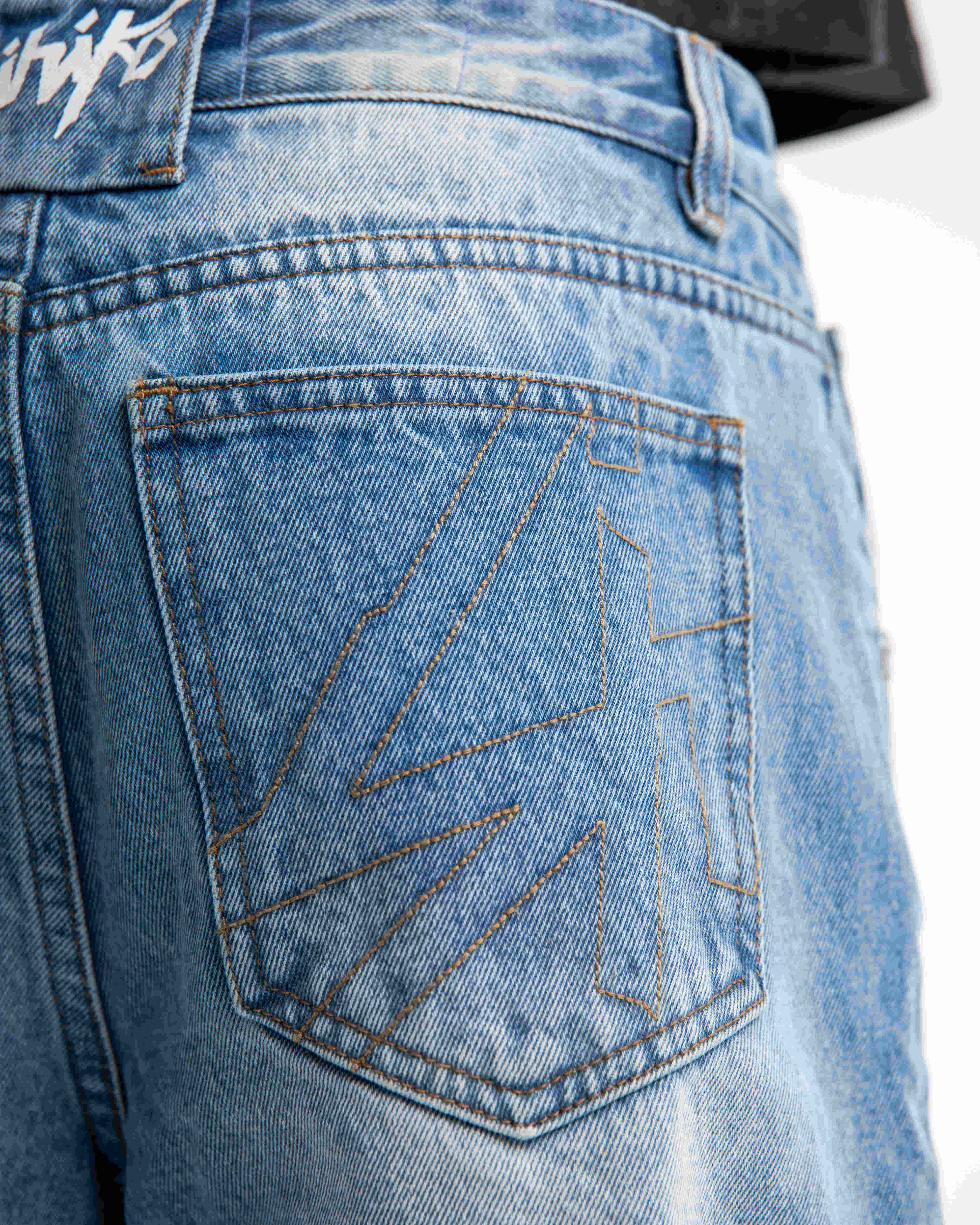 Starlit Huntress Jeans with a baggy, over-ankle fit, crafted from 100% cotton denim in a natural indigo light wash. These jeans feature custom satin embroidery of Artemis shooting an arrow on the back left pocket and screen prints down the back of both pant legs. Finished with custom dull silver metal rivets and buttons, these jeans pay homage to the Greek goddess of the hunt, blending mythological detail with modern craftsmanship.