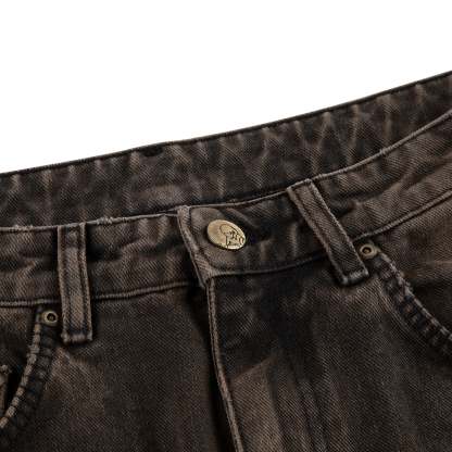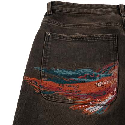14,5 oz denim / 100% cotton/ 300 000+ stitches embroidery back details/ leather patch on back/ these are shorter compared to first batch/ baggy fit